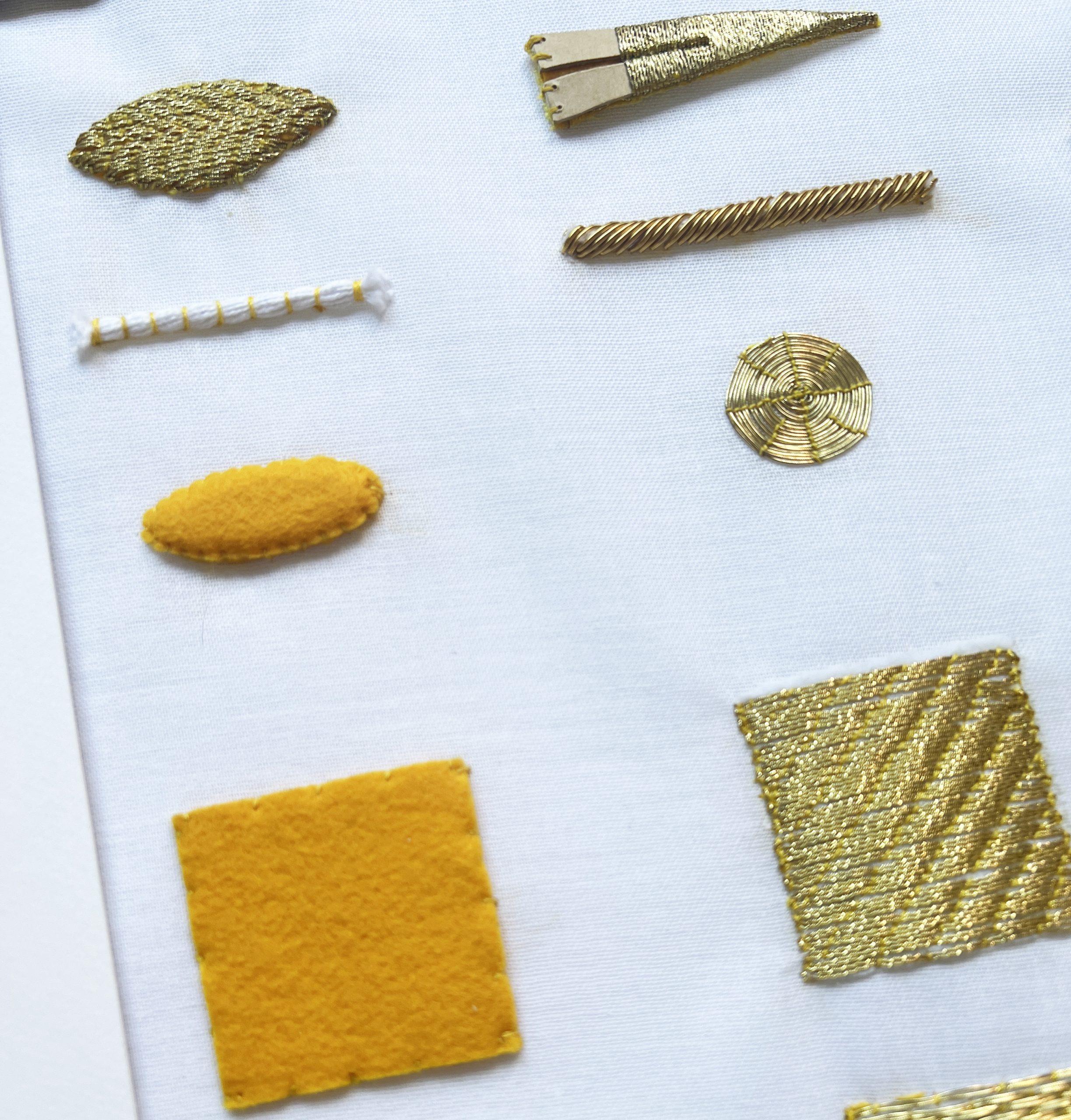Trabajarás diferentes ejercicios sobre loneta de algodón, donde combinaremos puntadas del Goldwork tradicional con técnicas de trabajo con hilos de bordar y pedrería dirigidoa un diseño moderno y actual.